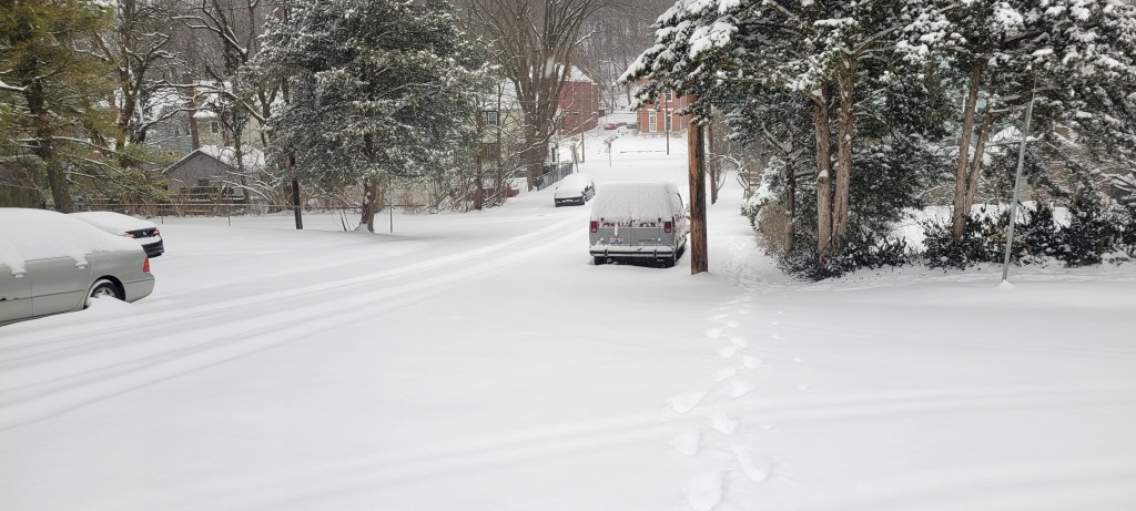 This was my street a week ago. Padfoot and I are still dealing with the weather. Wesleyan still has not been plowed, and with temps below 10 degrees, our morning walks are short. Most of the neighborhood sidewalks are foot-wide channels, so forget the usual training exercises. That means doing more indoors.